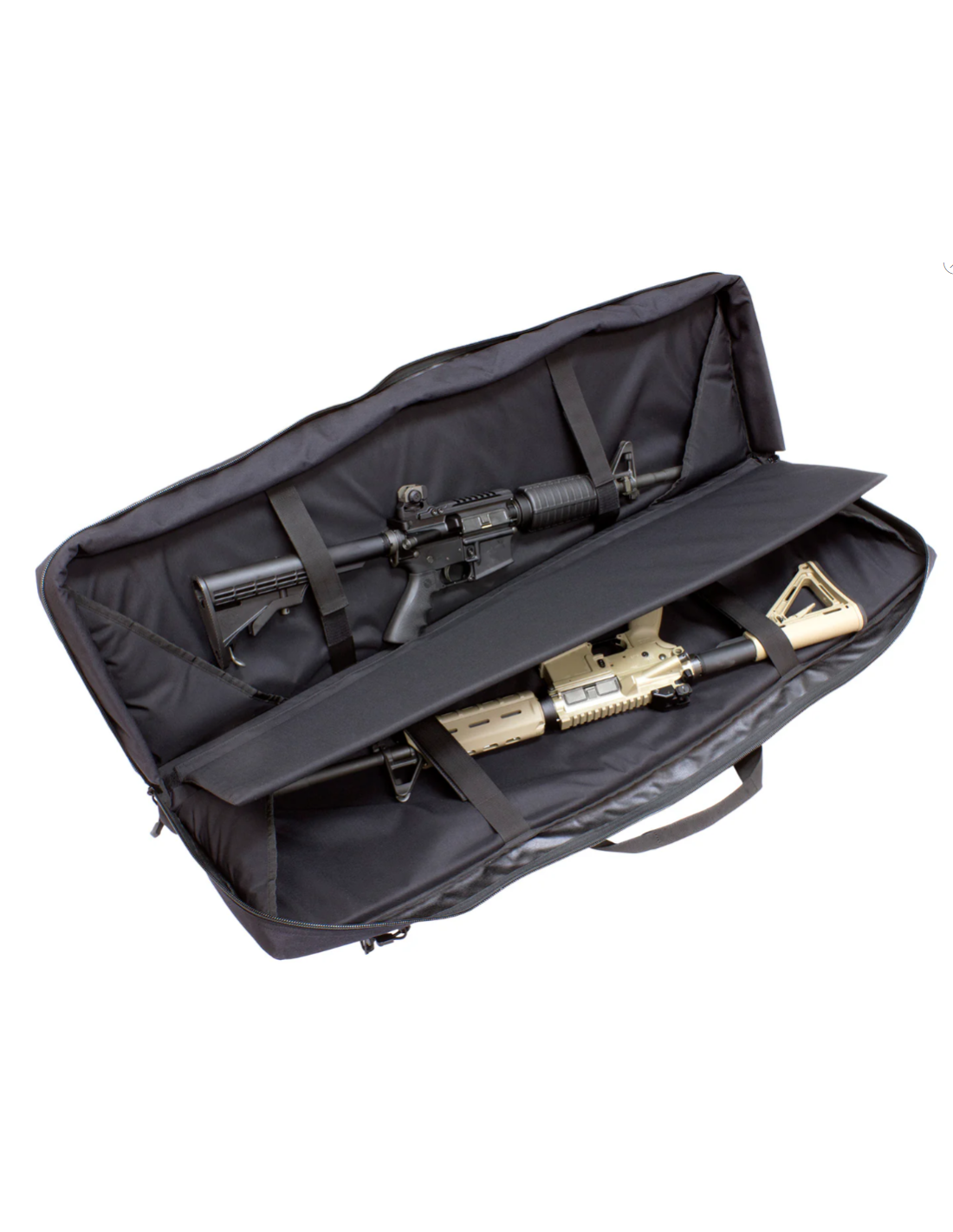 Peut contenir deux armes ; séparées par une cloison interne rembourrée Corps en nylon durable 1000 deniers avec fermetures à glissière et quincaillerie robustes La fermeture à glissière couture à couture permet à la mallette de s'ouvrir à plat Rembourrée avec de la mousse à cellules fermées Des attaches internes et des manchons rembourrés maintiennent les armes en sécurité Deux poches à accessoires à fermeture à glissière, l'une rembourrée La triple pochette à chargeur sur l'extérieur contient 6 chargeurs Une pochette pour trois chargeurs à l'extérieur peut contenir jusqu'à 6 chargeurs Poignée enveloppante extra-large et résistante avec crochets et boucles Le rabat interne rembourré sur la longueur de la fermeture éclair protège le contenu L'étui double pour fusils est livré avec une bandoulière confortable rembourrée de 2" L'étui double pour fusils est disponible en noir seulement Anneaux en "D" pour attacher les courroies du sac à dos Dims :43" X 13" X 4"