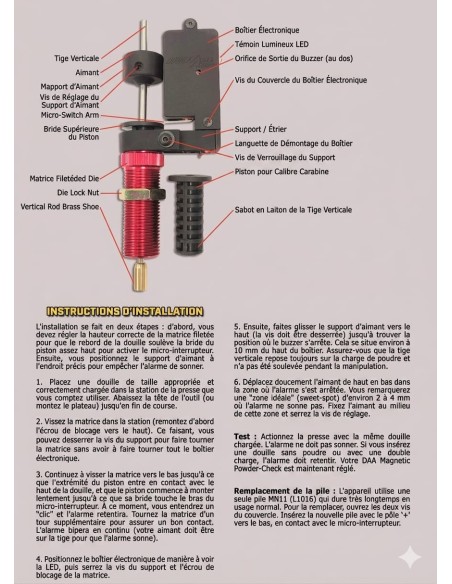 Le contrôleur de charge de poudre DAA Magnetic se monte sur une station immédiatement après votre doseuse de poudre et se visse dans une station de filetage de filière standard 7 / 8-14. Cependant, contrairement aux autres systèmes de contrôle de la poudre, le produit DAA ne nécessite pas de trou dédié percé dans la tête de l'outil à côté de la station! Il peut être utilisé sur N'IMPORTE QUEL rechargeur progressif disposant d'une station après la doseuse de poudre.
