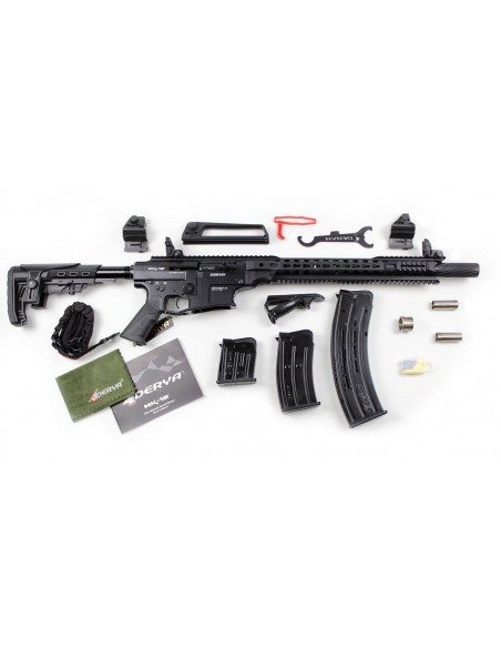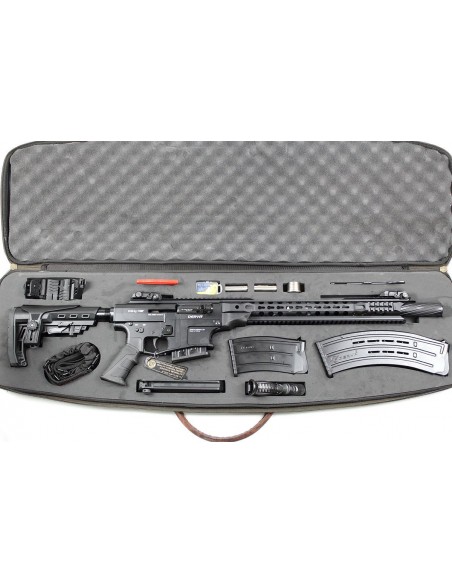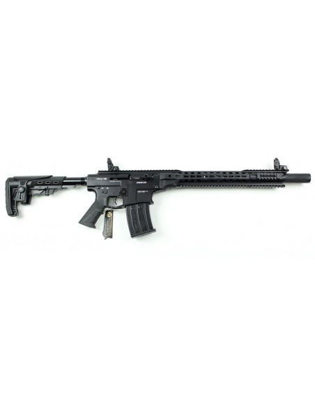 Fusil d'assaut semi-automatique Derya modèle MK-12 couleurs Noir et Vert, calibre 12/76, de fabrication Turque. Livré avec 3 chargeurs (1 de 3, 1 de 5 et 1 de 9 coups), de nombreux équipements et accessoires.