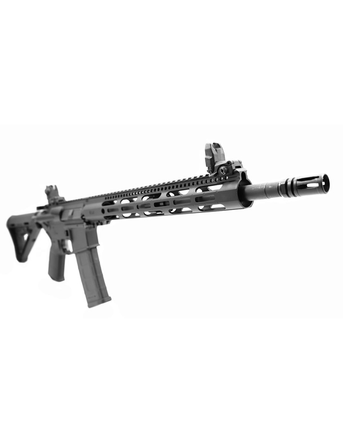 Canon : Canon en acier chrome-moly vanadium chambré en 5.56 NATO, avec un taux de torsion de 1:8, une extension de canon M4 et un système de gaz à mi-longueur. Ce canon de profil A2 est complété par un garde-main DPMS M-Lok de 13,5 pouces, un bloc de gaz à profil bas et un cache-flammes A2.