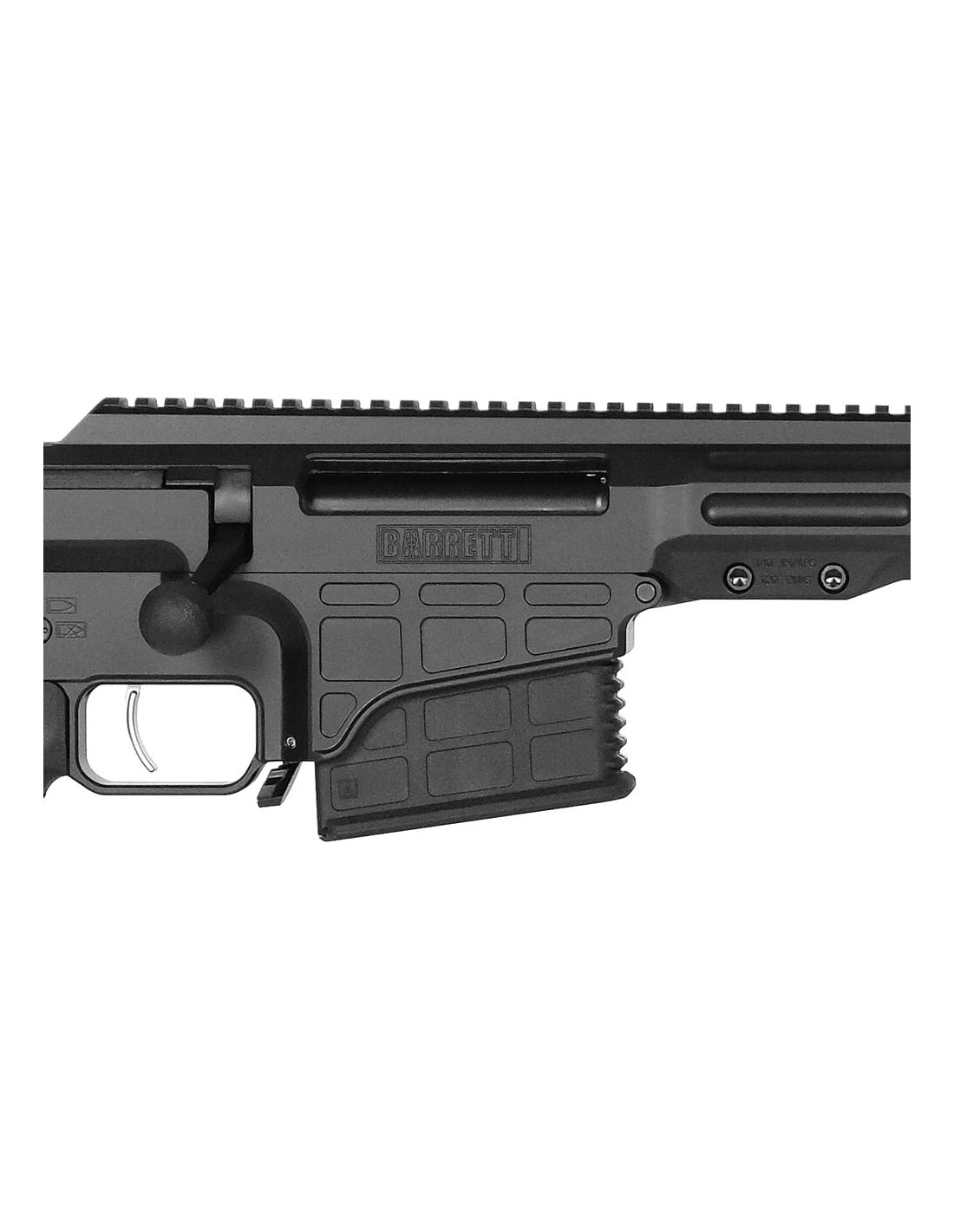 Un rail Picatinny M1913 avec une conicité de 20 MOA est intégré dans la partie supérieure en aluminium de la série 7000 du fusil Barrett MRAD. D'une longueur de 21,75 pouces, le rail offre beaucoup d'espace pour les dispositifs de vision nocturne en ligne. Les rails latéraux et inférieurs configurables permettent le montage d'un certain nombre d'autres accessoires.