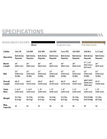 Avec des fentes de montage à 3, 6 et 9 heures, son garde-main offre une interface rigide et hautement adaptable pour la fixation de rails, d'électro-optiques et d'autres accessoires. Doté d'un système de canon interchangeable par l'utilisateur, le MRAD peut être rapidement et facilement converti en l'un des 7 calibres différents ou en plusieurs longueurs de canon en desserrant simplement deux boulons à l'aide d'une clé Torx standard ; aucun armurier n'est nécessaire.