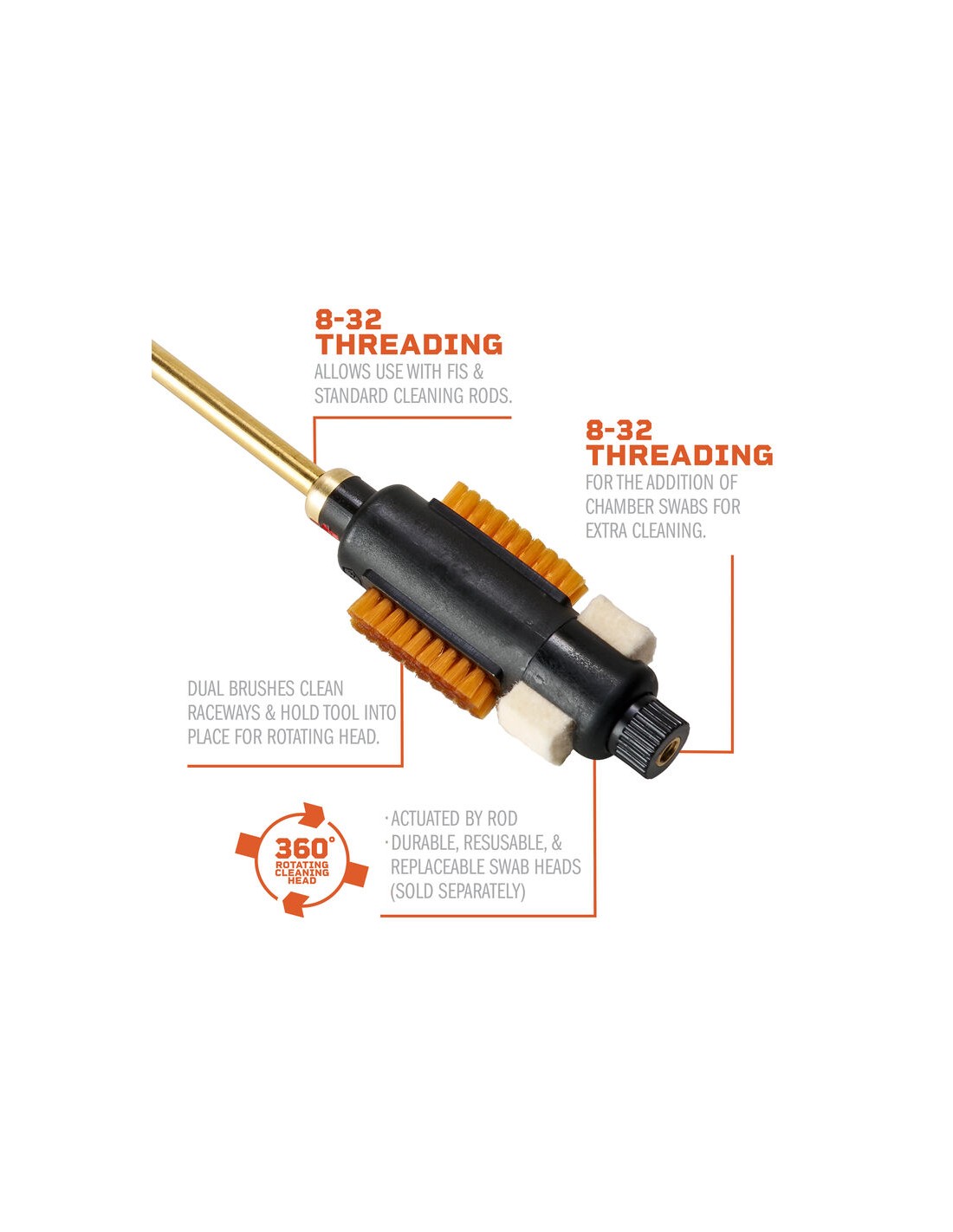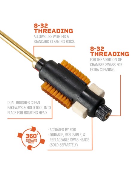 Assurez-vous que votre fusil fonctionne correctement en éliminant la saleté et les résidus de votre mécanisme à l'aide de la brosse Quick Action Brush pour modèle 700 de Fix It Sticks. Elle est dotée de brosses horizontales fixes sur les côtés pour nettoyer les glissières et maintenir l'appareil en place pendant que vous faites tourner le coton-tige souple dans les rainures des ergots. Pour faciliter l'opération, utilisez une tige Fix It Sticks avec un filetage 8-32, vendue séparément, pour faire tourner le tampon. Des paquets de cinq tampons de rechange sont disponibles.