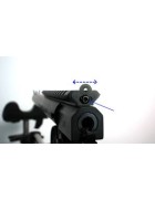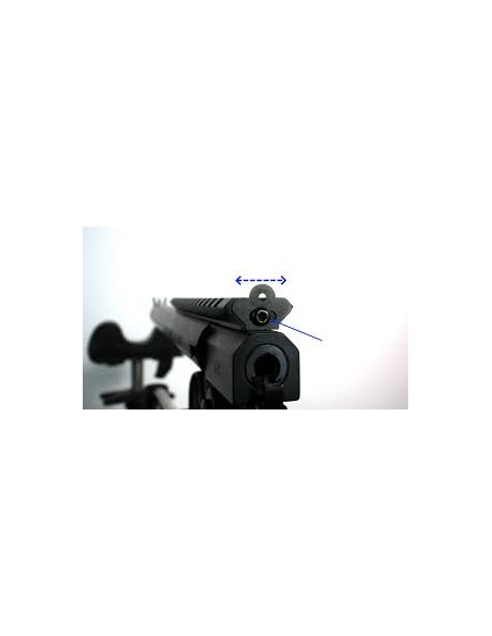 La visée arrière en acier est réglable en dérive et présente un design discret permettant de monter l'optique plus près du canon