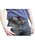 L'étui à clip Elite IWB est conçu pour un port à l'intérieur de la ceinture et une dissimulation maximale. Cet étui à l'intérieur de la ceinture est fabriqué en nylon balistique multicouche, tourné et matelassé, et dispose d'un clip robuste en acier à ressort qui s'accroche et se décroche des ceintures jusqu'à 2,25" de large. L'étui de ceinture convient à plusieurs styles de tirage et est disponible dans des tailles adaptées à la plupart des pistolets et revolvers. Cet étui de ceinture est ambidextre - le clip peut être déplacé du côté opposé pour un port à gauche, ou pour passer d'un port appendice à un port dorsal. L'étui est également équipé d'un frein de pouce amovible et réglable. La conception élégante et confortable de cet étui à l'intérieur de la ceinture et son profil fin en ont fait un best-seller !