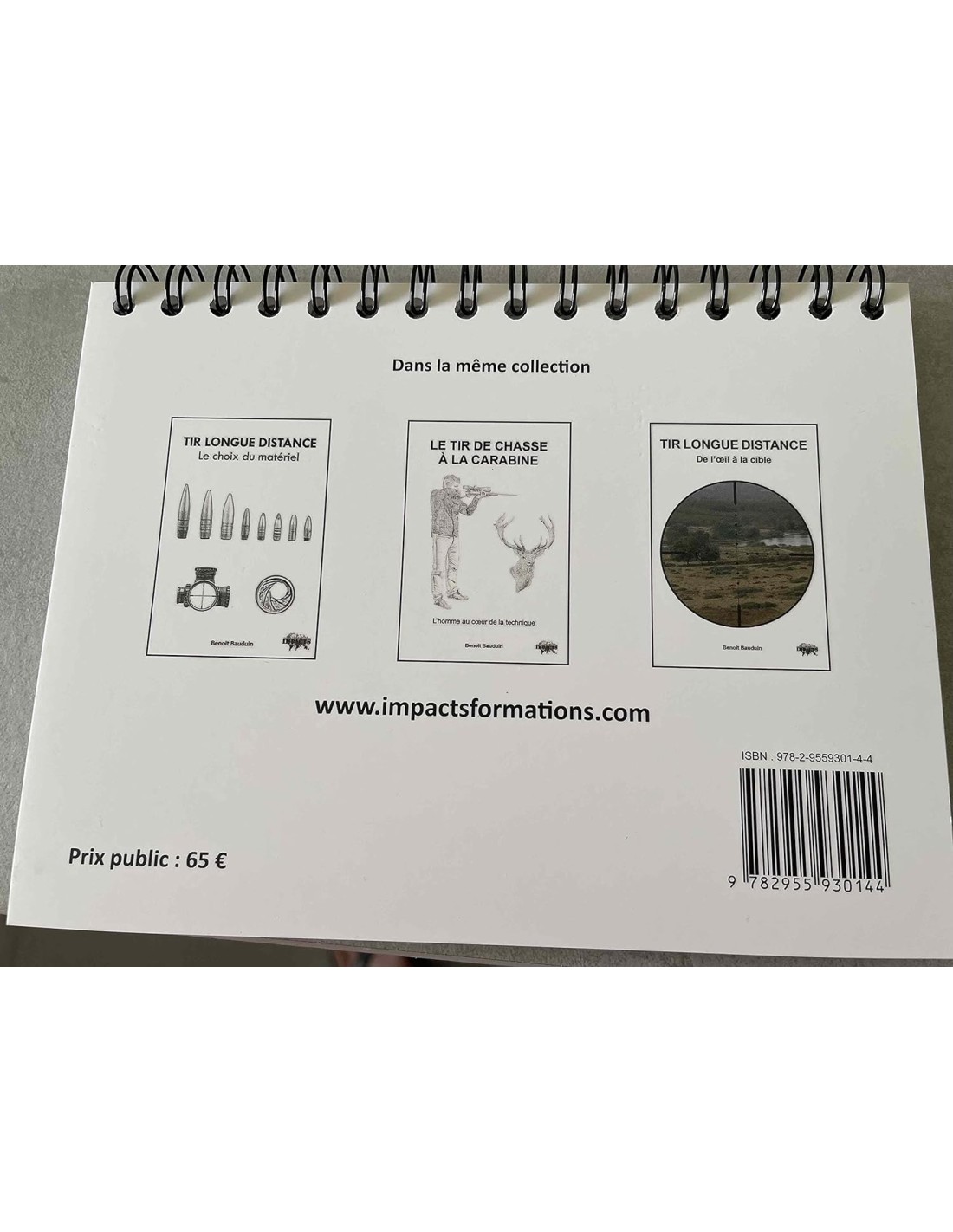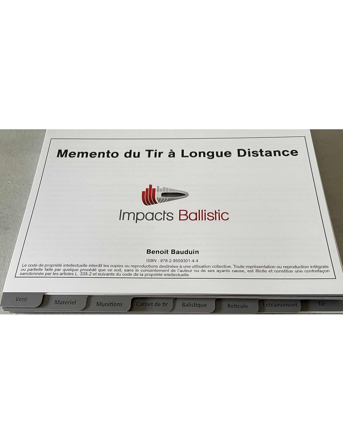 Le mémento se présente sous la forme d’un carnet à spirale au format A 5. Le pelliculage rend le mémento utilisable sous la pluie et vous permet de prendre des notes à l’aide d’un crayon papier HB. Couverture 160 X 210 mm 400 Gr/m2. Pelliculage mat 2 faces. Reliure Wire/O. Spirale noir. 50 feuillets recto verso 148 X 210 mm 150 Gr/m2 Pelliculage mat 2 faces Blanc. 8 intercalaires avec onglet 158 X 210 mm 300 Gr/m2 afin de retrouver rapidement les informations souhaitées. Pelliculage mat 2 faces gris. 4 réticules imprimés sur transparent 200 Gr/m2 pour vous entrainer seul ou en binôme. Description des différents éléments du mémento : Informations sur le matériel utilisé Les manipulations de l’arme Les fondamentaux du tir Méthode de lecture du vent Echelles de lecture du vent Les différents éléments influençant le point d’impact Le mirage atmosphérique Effets des ombres noires La contre visée Les couples de serrage Guide de montage du Magnetospeed Données des munitions manufacturées Données des munitions rechargées Données balistiques extérieures Dispersion verticale de la munition jusque 3200 m Carnet de tir Définitions balistiques Définitions optiques Le calcul de la pente d’un montage Tables de conversion Estimation des distances (Mildot, MSR) Tir sur cible mobile La préparation des tirs Hausses corrigées pour le tir en site Exercices de renforcement musculaire adaptés au tir Exercices d’entraînement de 100 à 300 m Exercices d’entraînement à plus de 300 m Communication spotter – tireur Exercices pour les positions adaptées Réticules sur transparent pour s’entraîner à la communication