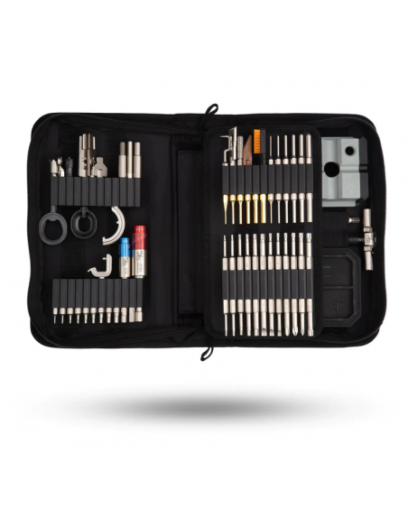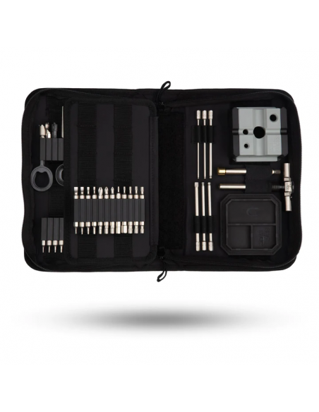 Cette boîte à outils contient un assortiment d'outils conçus pour vous aider à entretenir vos fusils, pistolets et fusils de chasse et à serrer vos optiques et accessoires au couple correct. Comprend les pièces / embouts spécialisés suivants :