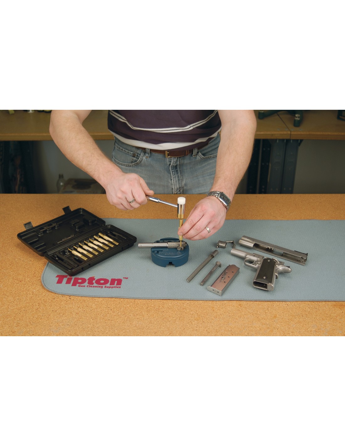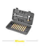 Le jeu de marteaux et de poinçons Wheeler® comprend un marteau en polymère/laiton, huit poinçons de précision en laiton, quatre poinçons en acier et deux poinçons en plastique. Il est livré dans une mallette moulée très pratique. Il s'agit d'un outil idéal pour enfoncer les goupilles ou dériver les viseurs au stand de tir ou sur l'établi de l'armurier.