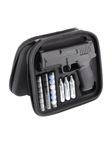 Le Impax P68 Set est un modèle CO2 intégrant le système Quick-Piercing (Response Ready Trigger) qui perce automatiquement la capsule de CO2 dès la première pression sur la détente, garantissant une mise en service immédiate. Sa précision améliorée assure une portée efficace élevée. La vis du compartiment CO2 intègre un limiteur de couple STS assurant un serrage optimal et une étanchéité constante. L'outil de mise en place de la capsule CO2 est directement intégré au chargeur. Une sécurité empêche le tir en l'absence de chargeur inséré, complété par une sécurité automatique de détente. Il dispose d'organes de visée à fibre optique pour une acquisition rapide de la cible, d'un rail Picatinny pour le montage d'accessoires et d'un bouton d'éjection du chargeur ambidextre.