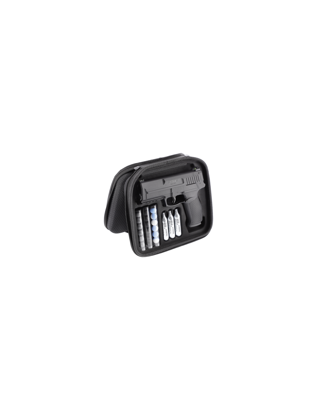 Le set comprend une mallette de transport, 3 capsules CO2, 6 billes caoutchouc, 6 billes polymère et 6 billes craie.