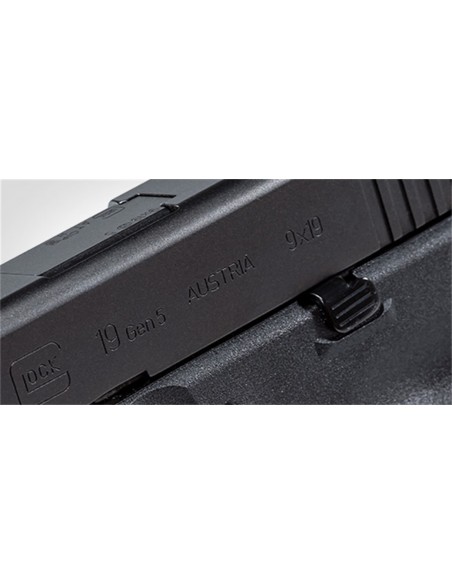 Le pistolet GLOCK 19 Gen5 en 9 mm Luger est idéal pour un rôle plus polyvalent du fait de ses dimensions réduites. La nouvelle conception de la carcasse sans rainures pour les doigts permet toujours de personnaliser instantanément sa prise en main pour s'adapter à n'importe quelle taille de main en montant les différents dosserets arrière Beavertail.