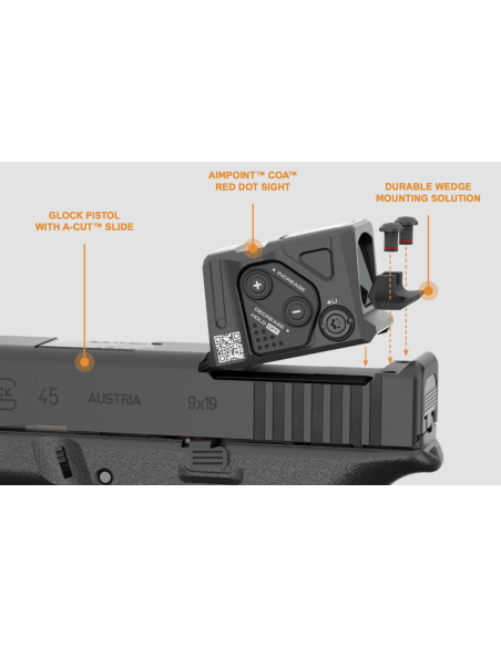 Combiné à L'AIMPOINT COA, développé et conçu en mettant l'accent sur l'expérience de tir, associe facilité d'utilisation, fiabilité, performance et innovation dans un design ultra-compact. Son design épuré, son faible poids et ses dimensions compactes font de l’optique COA l’idéal. Compact et robuste, L'AIMPOINT COA offre aux tireurs une expérience de tir exceptionnelle avec une norme de montage révolutionnaire : l’A-CUT d’Aimpoint, sa découpe directe stabilise le viseur dans toutes les directions et offre un profil extrêmement bas, le viseur étant monté profondément dans la glissière.