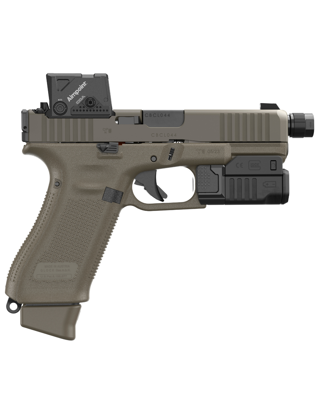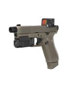 GLOCK présente ici l'édition Hunter du G45 COA spécifique par sa couleur vert olive et ses équipements: