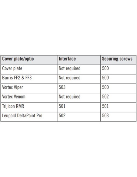 Le système exclusif de montage d'optiques du FN Five-seveN MRD consiste en une série de plaques qui adaptent votre optique à la glissière pour une installation rapide et transparente - il suffit de retirer la plaque de recouvrement, de sélectionner la plaque optique et le jeu de vis compatibles avec votre MRD et de monter à l'aide de la quincaillerie fournie. Le système est compatible avec la plupart des empreintes d'optiques courantes, offrant une variété inégalée d'options.