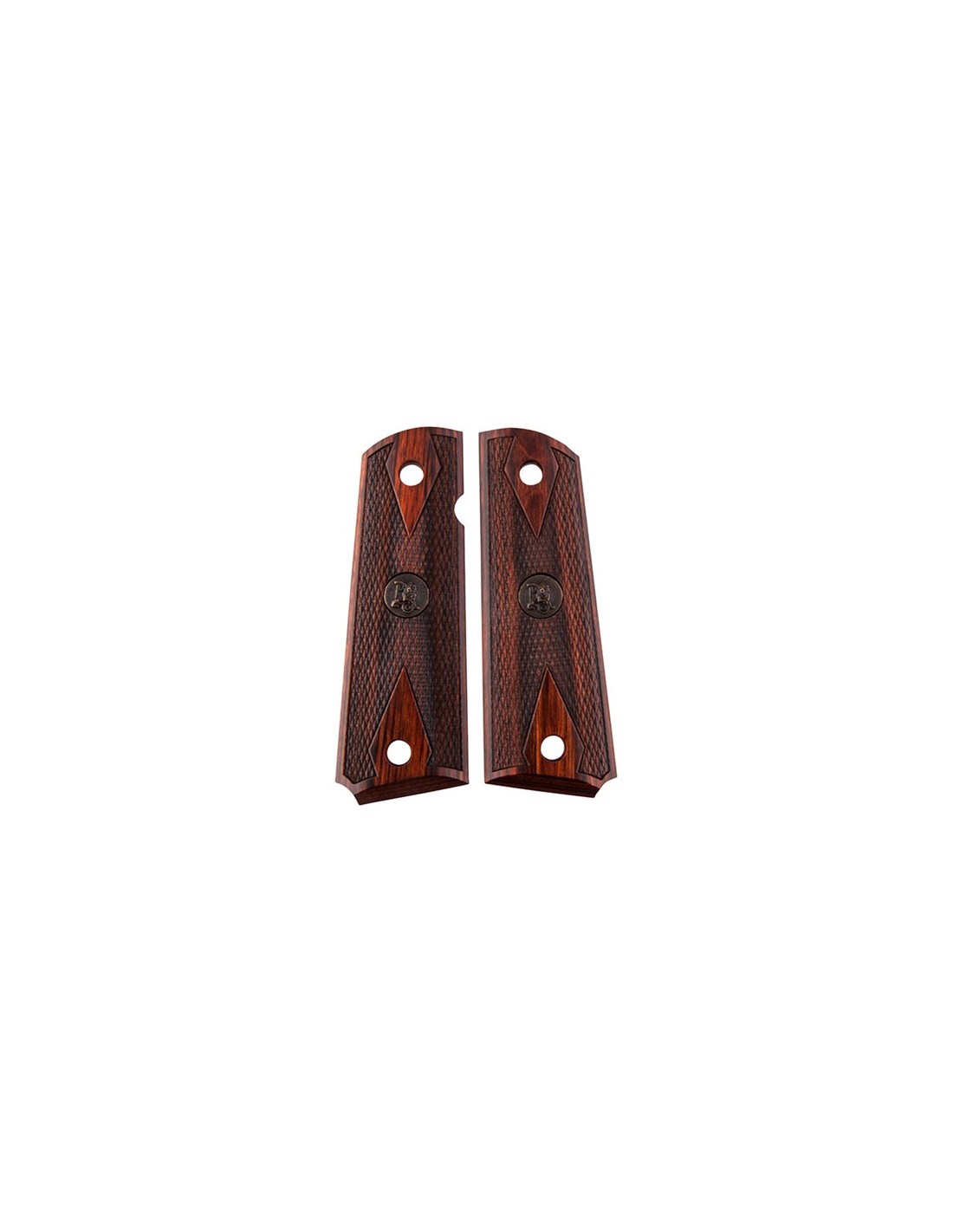 Poignées classiques 1911 American Legend de Pachmayr. Ces poignées présentent un joli et propre quadrillage, disponible en motif double losange ou demi-quadrillé. Les poignées incluent un insigne Pachmayr. Le bois de rose offre une apparence distinctive, avec un grain contrasté.