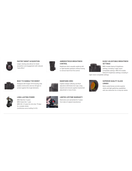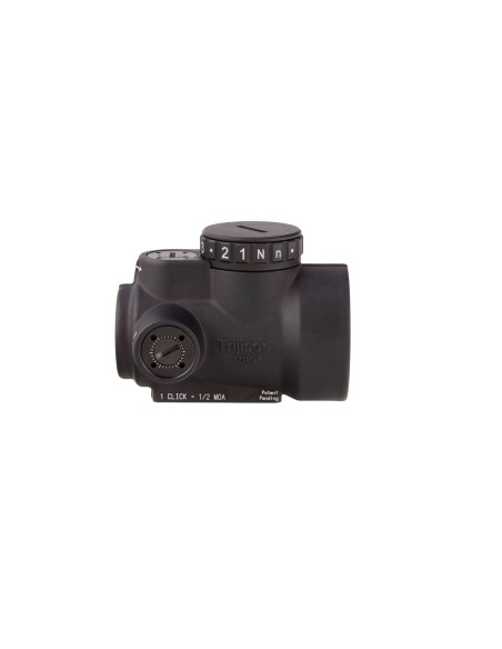 Le Trijicon Miniature Rifle Optic (MRO®) est un viseur scellé de type reflex destiné à être utilisé sur les fusils, les carabines et les fusils de chasse pour permettre une acquisition rapide de la cible. Elle est conçue pour être utilisée avec les deux yeux ouverts, ce qui permet à l'opérateur d'avoir une connaissance maximale de la situation. Le Trijicon MRO avec point vert perpétue la fiabilité légendaire du MRO, avec un point vert réglable de 2,0 MOA et une clarté de lentille exceptionnelle avec un réticule qui a un plus grand contraste contre les forêts, les prairies et les environnements tropicaux. En effet, l'œil humain est plus sensible à cette couleur verte, ce qui rend ce MRO particulièrement efficace pour l'acquisition rapide de cibles dans des conditions de faible luminosité et d'éclairage transitoire. La grande ouverture et le trajet lumineux conique maximisent la zone de vision dans une optique aussi petite, ce qui permet un engagement rapide de la cible, en particulier à partir de positions de tir non standard. Les revêtements avancés de la lentille et l'électronique produisent un point vert net. La molette de réglage de la luminosité de la MRO est spécialement conçue pour une utilisation ambidextre. Avec une position de réglage intermédiaire "off" et huit réglages de luminosité discernables, cette molette de réglage de la luminosité permet des ajustements rapides et ergonomiques. Le MRO est doté d'ajusteurs entièrement protégés qui maintiennent le zéro même en cas de manipulation brutale, et qui peuvent être réglés sans outils spéciaux. Le boîtier forgé 7075-T6, anodisé dur, est entièrement scellé et étanche, ce qui lui confère une grande durabilité dans des conditions difficiles.