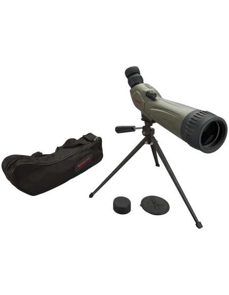 Cette lunette terrestre est livrée avec un trépied de table, un cache oculaire, un cache objectif et housse de transport cordura.