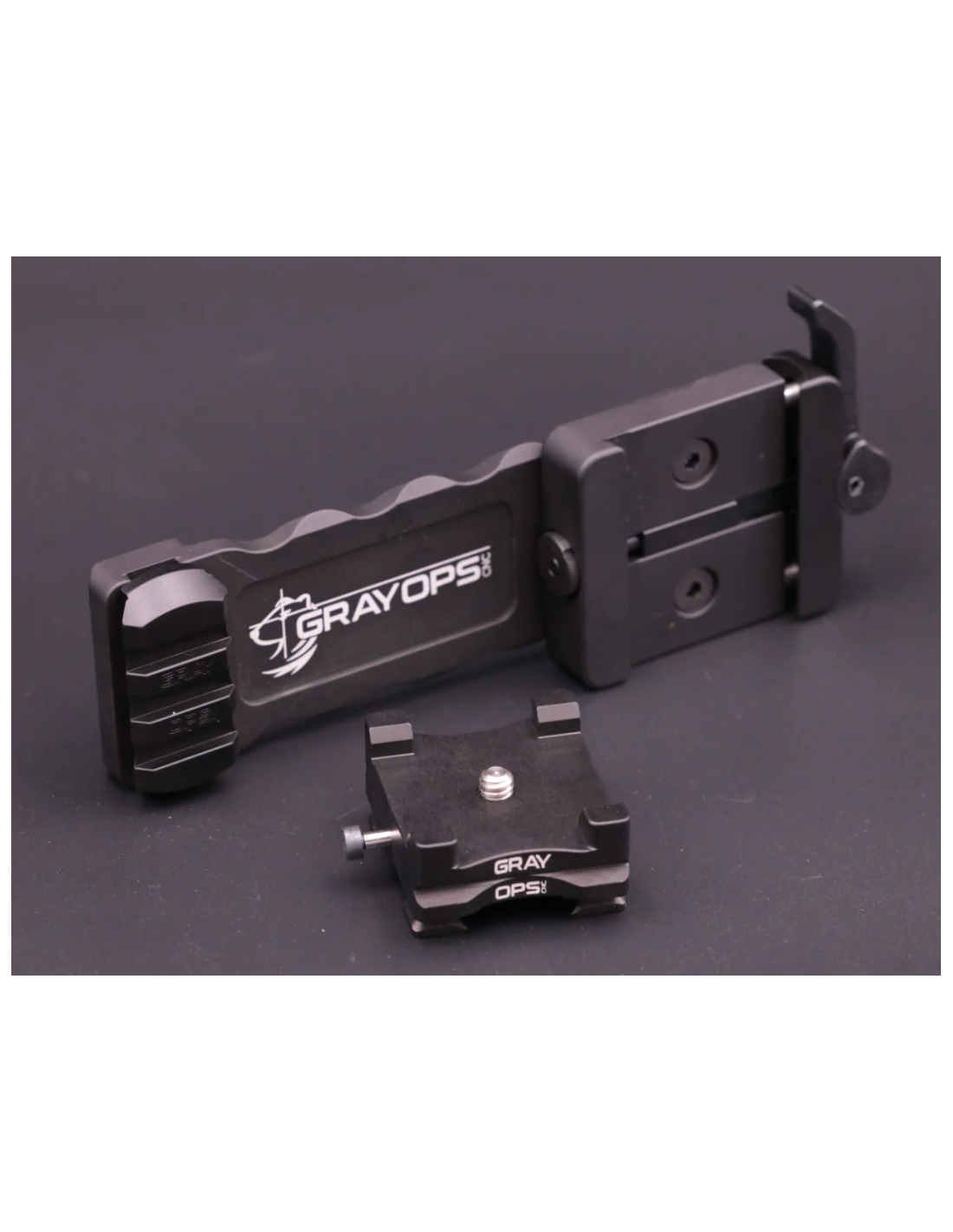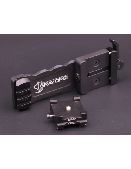 Le bras permet un montage latéral sur les rails Arca à l'aide de n'importe quelle pince compatible ARMS17, y compris notre propre levier QD Throw Lever de Gray Ops.